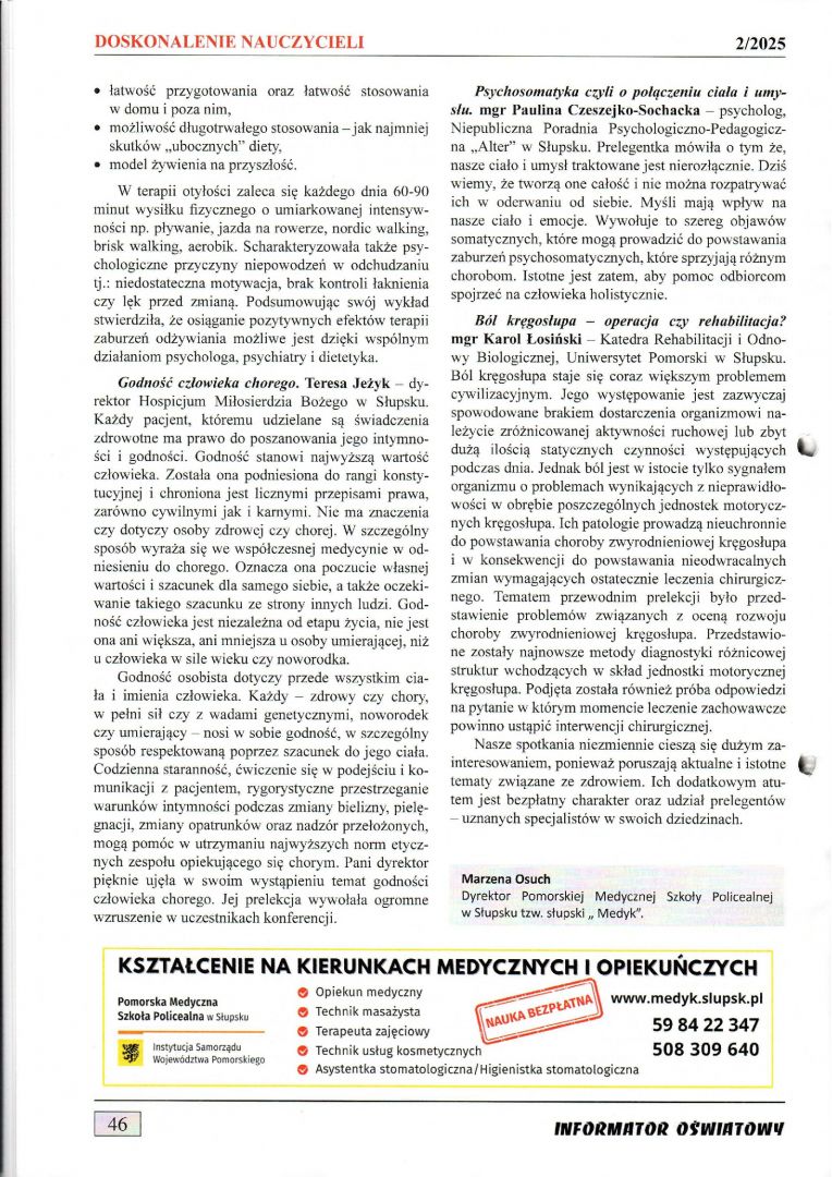 W biuletynie Pomorskiego Ośrodka Doskonalenia Nauczycieli w Słupsku Informator Oświatowy nr 2/2025 ukazał się artykuł , relacja z marcowej konferencji poświęconej proaktywnemu podejściu do zdrowia.